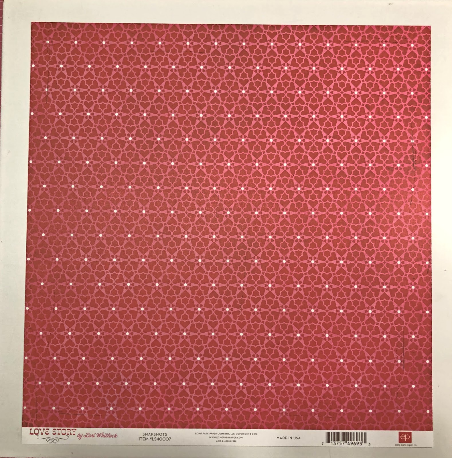 I chose Echo Park's Love Story Collection for my Valentine's Candy Box.  The Cardstock I chose from the collection was 1 sheet of Snapshot #LS40007.