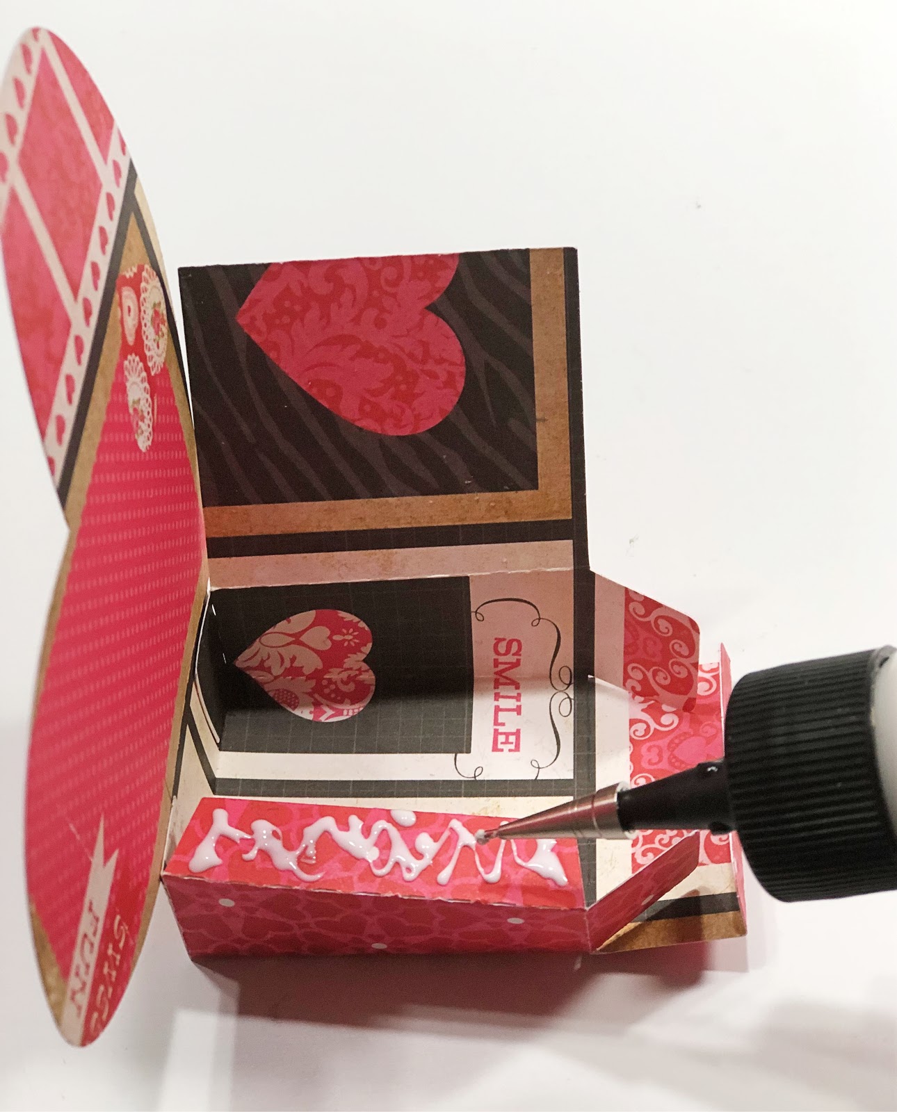 Again, turning the heart desk down, glue the box part to the heart rubbing the inside of the box to securely glue it together.