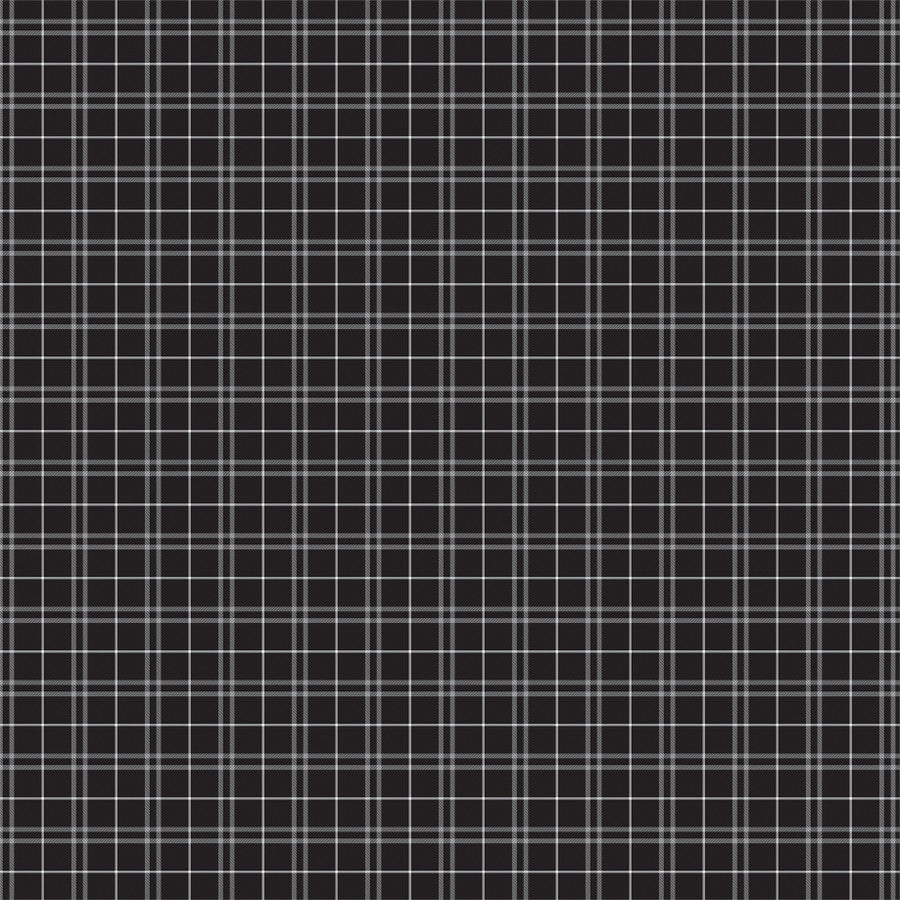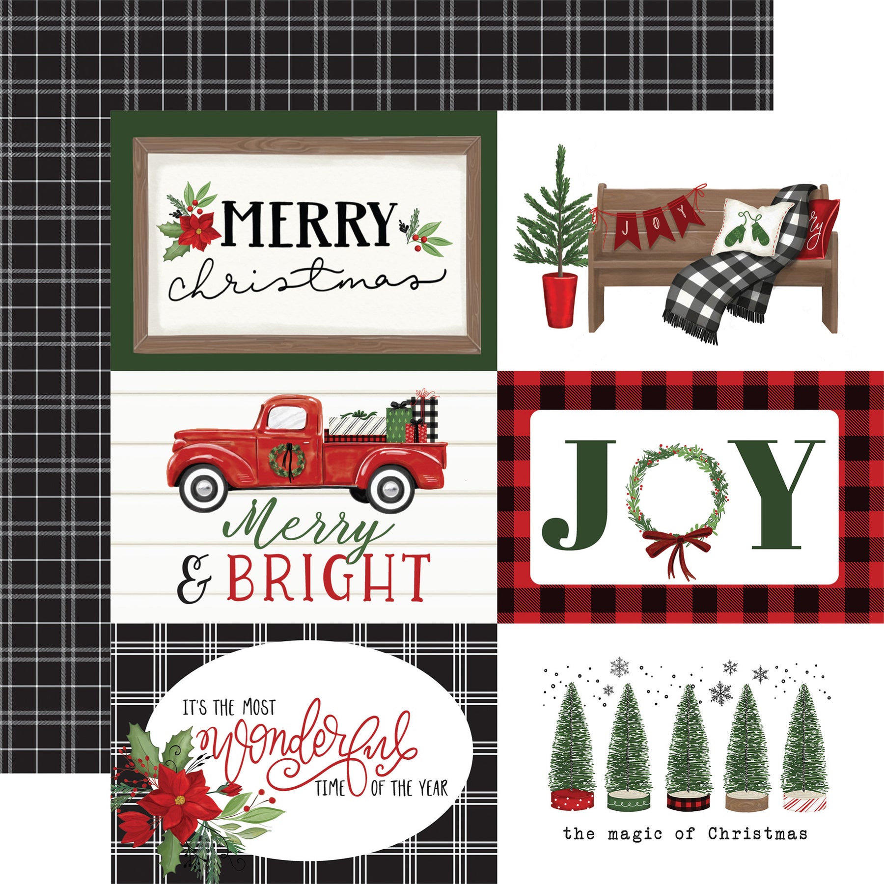 (Side A - six holiday-themed journaling cards featuring classic Christmas motifs in a red, green, black, and white color palette. The designs include traditional festive sentiments like "Merry Christmas" and "Joy," paired with cozy seasonal illustrations such as a vintage red truck carrying gifts, a wooden bench with a buffalo plaid throw, and a row of stylized pine trees. The aesthetic blends rustic farmhouse charm with graphic patterns like plaid and stripes. Side B - monochrome plaid pattern set against a solid black background. The design is composed of a dense grid of thin, intersecting white and grey lines of varying thicknesses, creating a classic tartan or windowpane effect.)