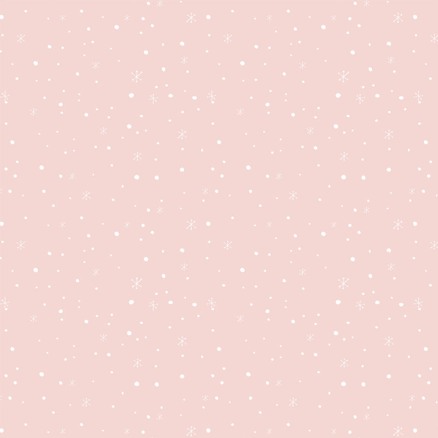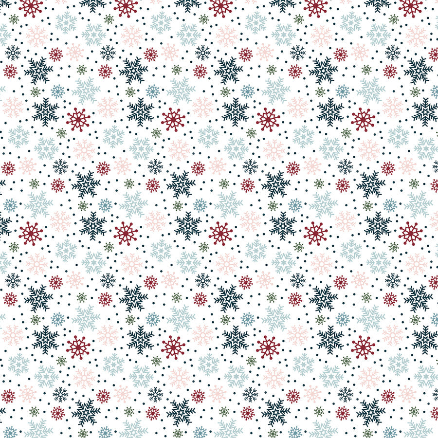 • (Side A - repeating winter pattern on a white background, filled with various stylized snowflake designs in a limited color palette of dark navy/teal, light blue, pale pink/red, and maroon. The snowflakes are mixed in size and shape, creating visual texture, and are further interspersed with small dots in the same colors. Side B - winter pattern set against a solid pale pink background, featuring small, scattered snowflakes and dots in white)*