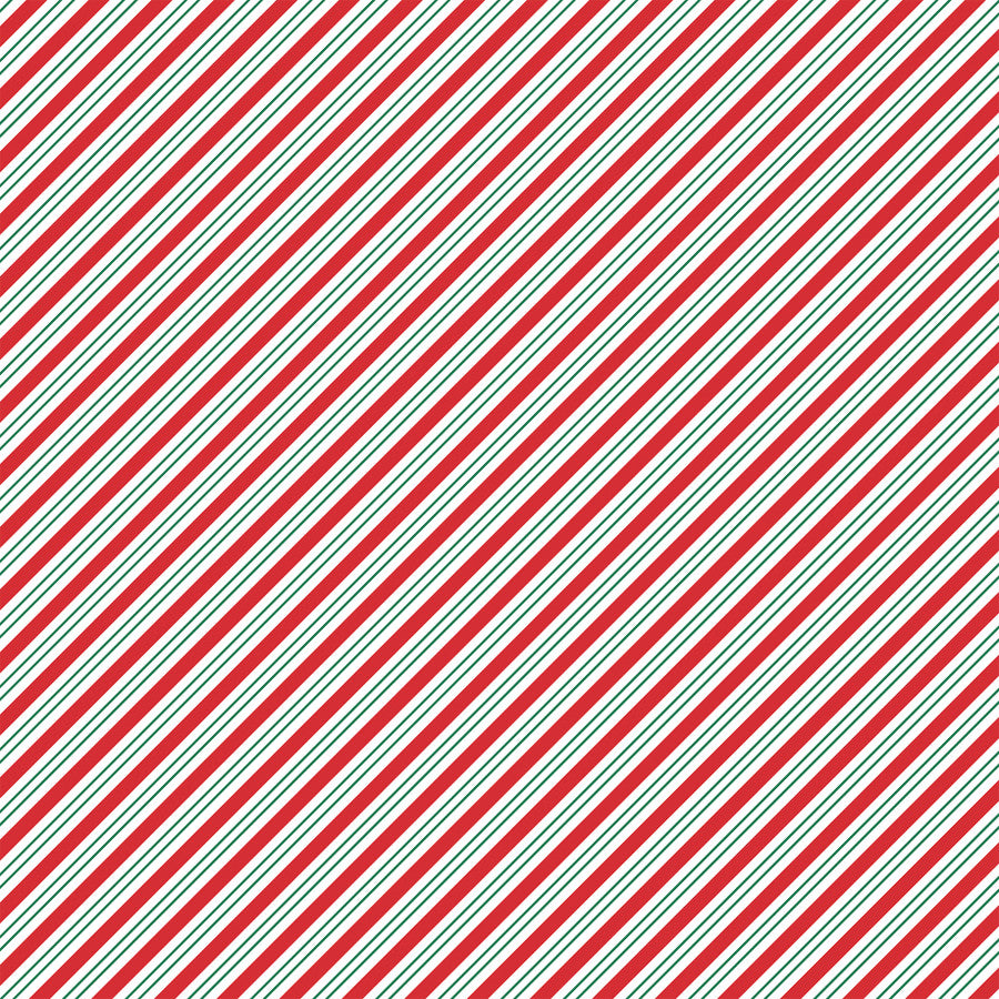 - (Side A - Christmas-themed journaling cards or decorative squares, each featuring a unique design and festive sentiment, set in a grid layout. The squares utilize a classic holiday color palette of red, green, white, and black, incorporating patterns like polka dots, stripes, and plaid. Key phrases and illustrations include: "OH BY GOLLY," "SANTA SQUAD," a snowman mug with a candy cane, "HOLIDAY Magic," "HERE Comes Santa CLAUS," "All is Bright" framed by string lights, cartoon Santa and reindeer, "May your Holidays be Bright...," "Wishing You Christmas CHEER...," a "From Santa with Love" tag, and "OFFICIALLY ON THE Nice LIST. Side B - diagonal stripe pattern featuring a repeating sequence of lines in traditional Christmas colors. The pattern consists of thick red stripes alternating with thin, parallel green stripes and equally thin white stripes, creating a classic, festive, and candy-cane-like design)*