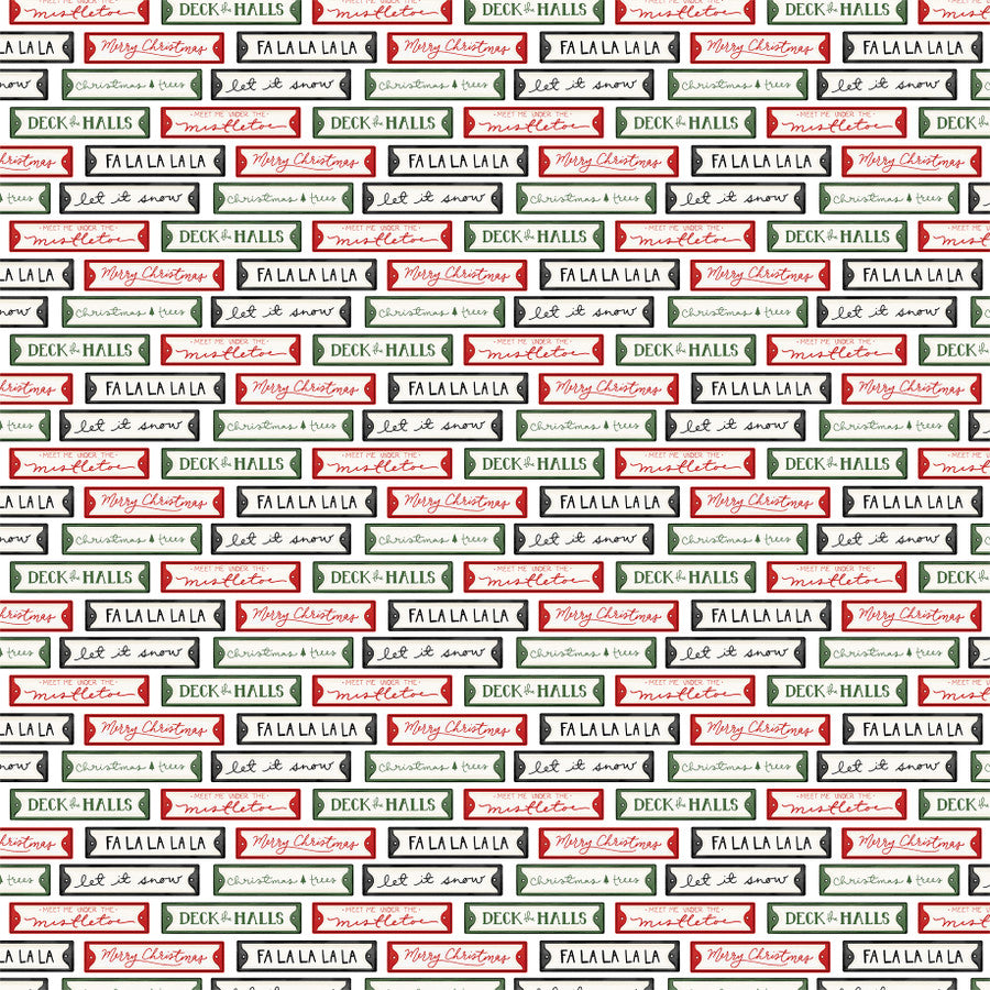 (Side A - a repeating Christmas-themed pattern designed to look like a wall of vintage enamel or metal street signs. Set against a clean white background, the rectangular signs are arranged in staggered, horizontal rows using a traditional holiday palette of forest green, deep red, and charcoal gray. Each sign features festive typography—ranging from elegant scripts to bold block lettering—with phrases such as "Merry Christmas," "Deck the Halls," "Let It Snow," "Christmas Trees," and "Meet Me Under the Mistletoe." Side B - hand-drawn snowflakes set against a solid, muted forest green background. The snowflakes are rendered in a slightly darker shade of green)