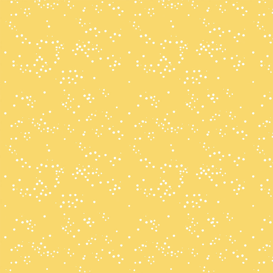 - (Side A - a seamless repeating pattern of illustrated Easter baskets set against a clean white background. The design is organized into vertical columns and includes four distinct basket variations: one containing a smiling white bunny tucked behind colorful flowers, one filled with brightly colored Easter eggs, one overflowing with pastel-toned flowers, and one containing three carrots with green leafy tops. Small, multicolored decorative stars are scattered between the baskets. Side B - a repeating pattern of delicate, white organic dots set against a soft yellow background)*