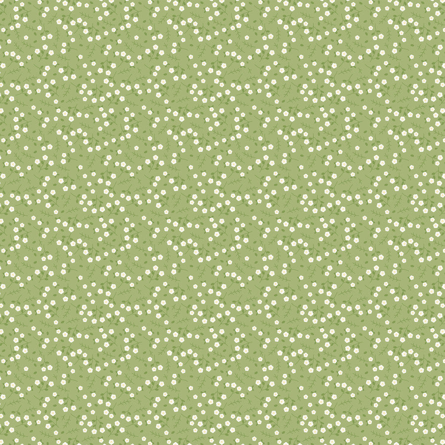 - (Side A - grid of nine charming spring-themed journaling cards, featuring a soft pastel color palette of pink, yellow, blue, and green. Each square contains a unique combination of whimsical illustrations—such as floral wreaths, birdhouses, sunhats, and bumblebees—paired with cheerful phrases like "Bloom Where You’re Planted" and "Sunshine & Flowers." The designs use a variety of patterns, including polka dots, stripes, and delicate floral prints. Side B - delicate floral pattern set against a muted, sage green background. The design consists of tiny, five-petaled white blossoms with soft yellow centers, densely scattered across the field. Interspersed among the flowers are minimalist, dark green leaf sprigs and thin, fern-like stems that create a sense of organic movement)*
