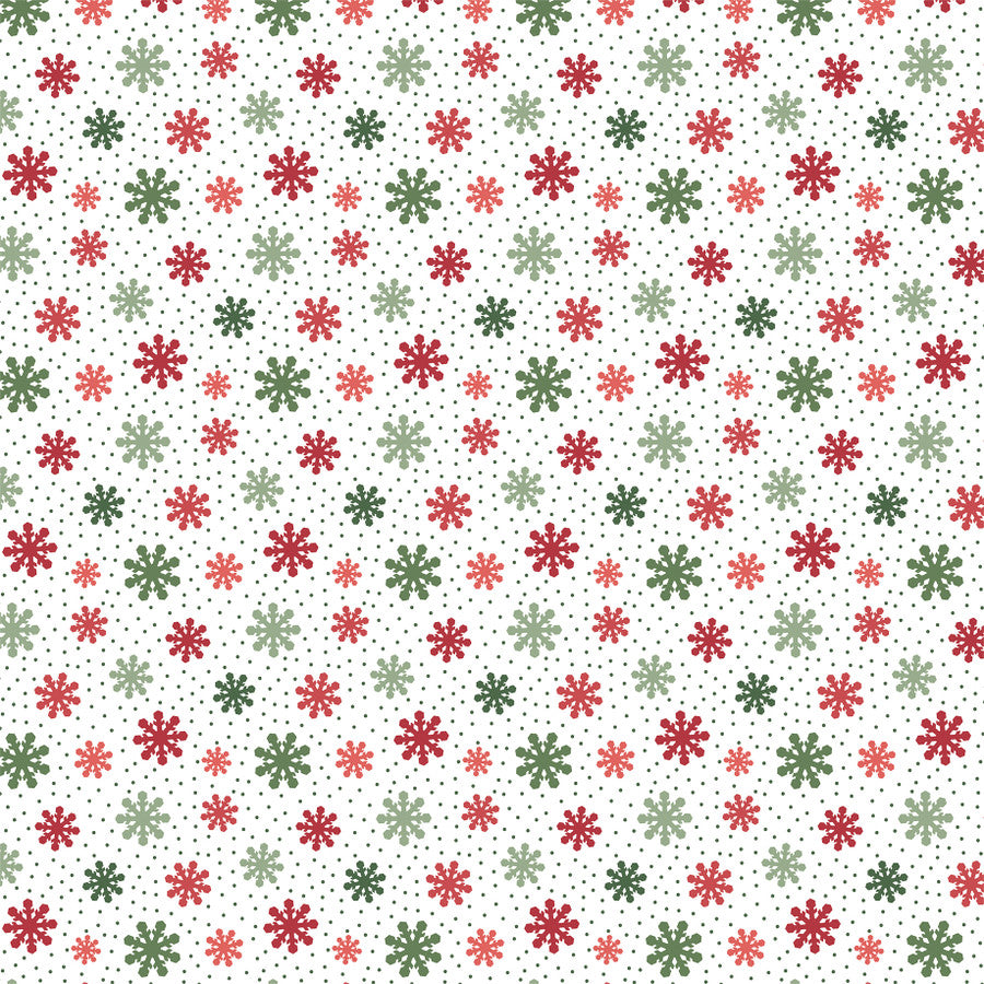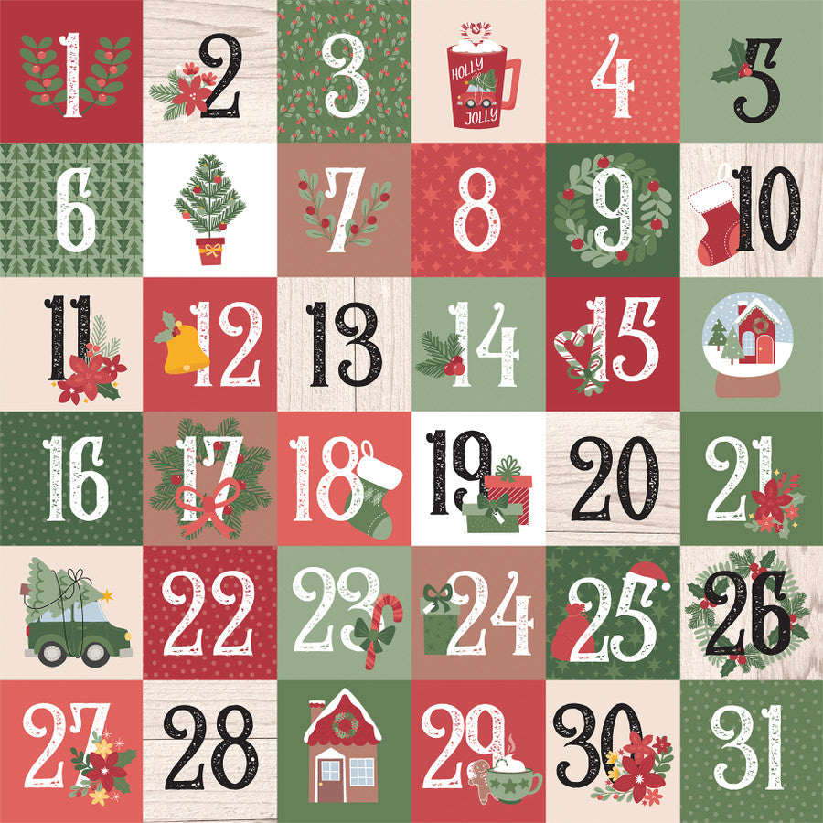 • (Side A - a festive Advent-style calendar grid featuring the numbers 1 through 31, likely designed for scrapbooking or holiday crafts. The layout consists of six rows of colorful squares in a palette of red, green, cream, and black, each decorated with unique patterns like polka dots, stars, and wood grain. Interspersed among the numbers are various Christmas illustrations, including wreaths, stockings, a snow globe, a vintage car with a tree, and cozy mugs of cocoa. The overall aesthetic is rustic and whimsical, capturing a traditional "December Days" holiday theme, Side B - repeating pattern of stylized snowflakes set against a white background peppered with tiny dark green dots. The snowflakes vary in size and come in a muted, traditional holiday palette, including deep red, coral, forest green, and sage green)*