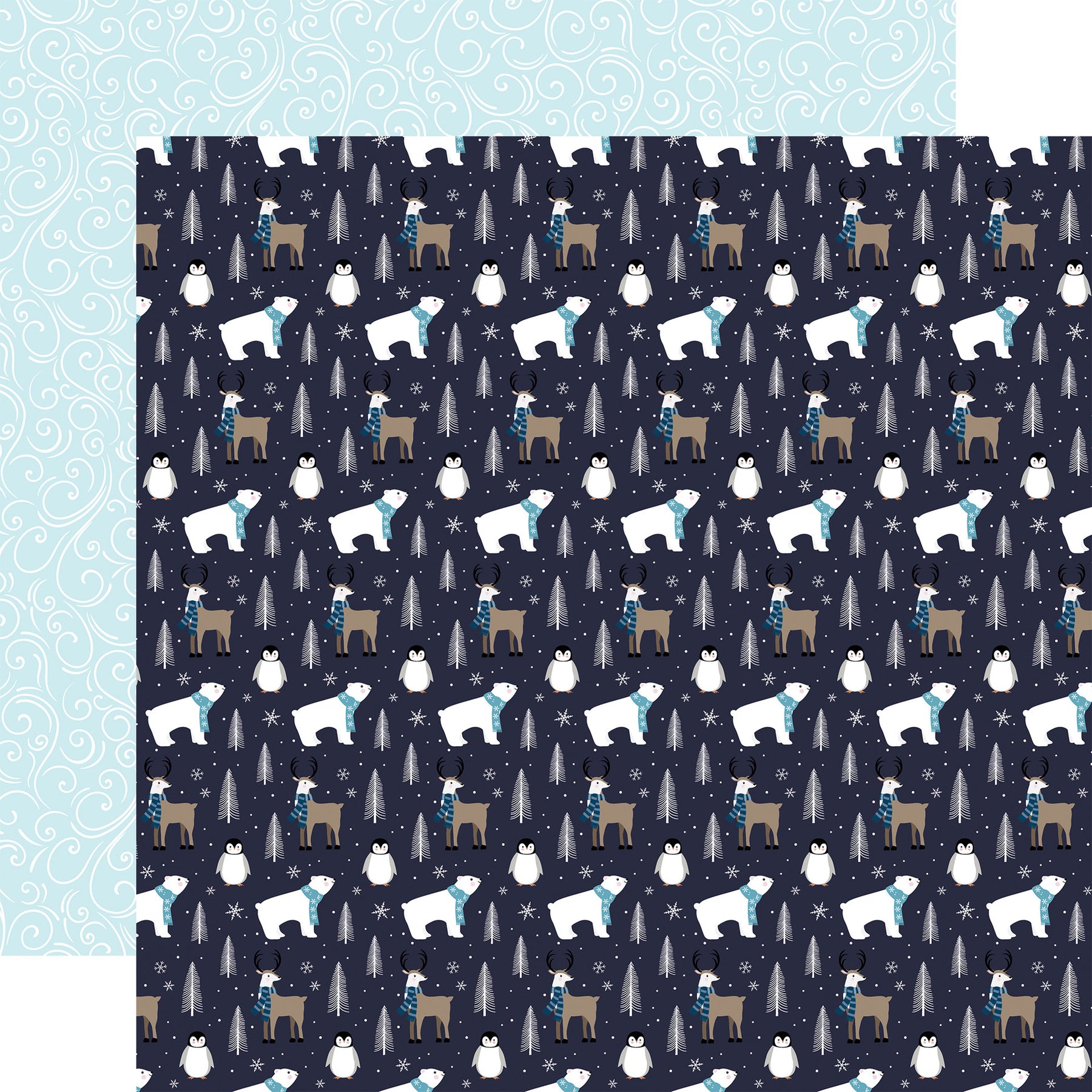 - (Side A - a whimsical, winter-themed seamless pattern set against a dark navy blue background. The illustration is stylized with arctic animals, including polar bears and reindeer wearing light and dark blue striped scarves, alongside small penguins. The scene is accented with minimalist white pine trees, delicate snowflakes, and a light dusting of white dots representing snow; Side B - a light blue background overlaid with a delicate white filigree pattern. The design consists of dense, interlocking swirls, scrolls, and flourishes that create a whimsical and elegant texture)*