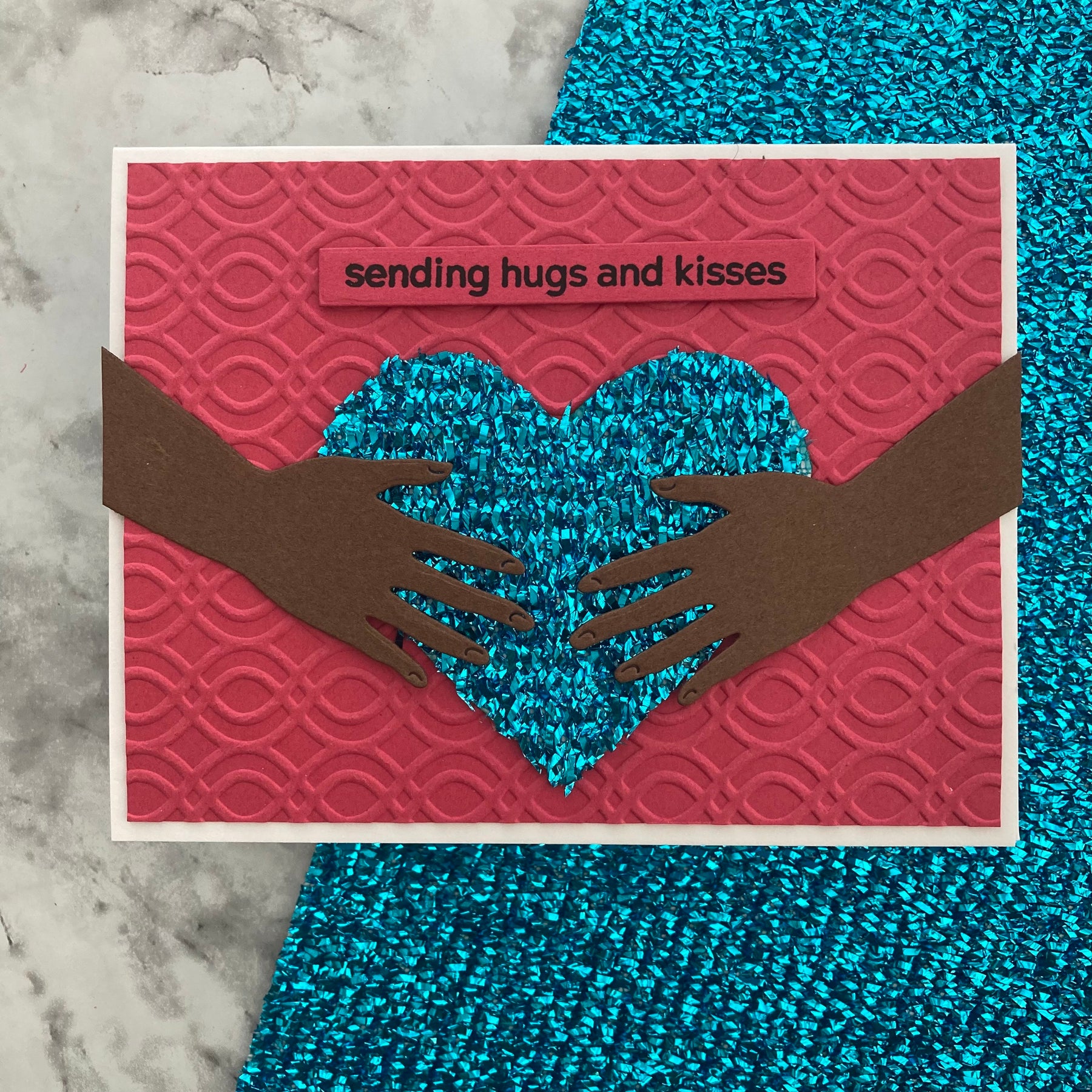 Card with blue glittery heart and hands holding it, on a textured surface.