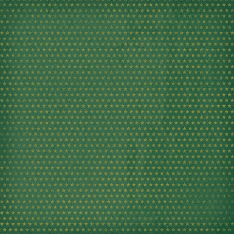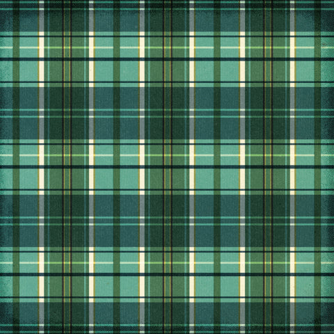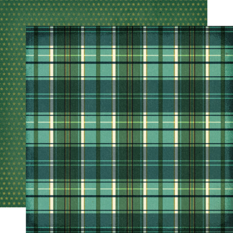 - (Side A - a classic plaid pattern composed of intersecting horizontal and vertical lines in varying widths. The color palette is dominated by shades of green, ranging from deep forest and teal to lighter mint tones, accented by thin stripes of cream and dark charcoal. Side B - a vintage-style pattern consisting of a dense grid of small, five-pointed stars. The stars are a muted, pale gold or tan color, set against a deep forest green background that has a textured, weathered appearance similar to aged cardstock)*