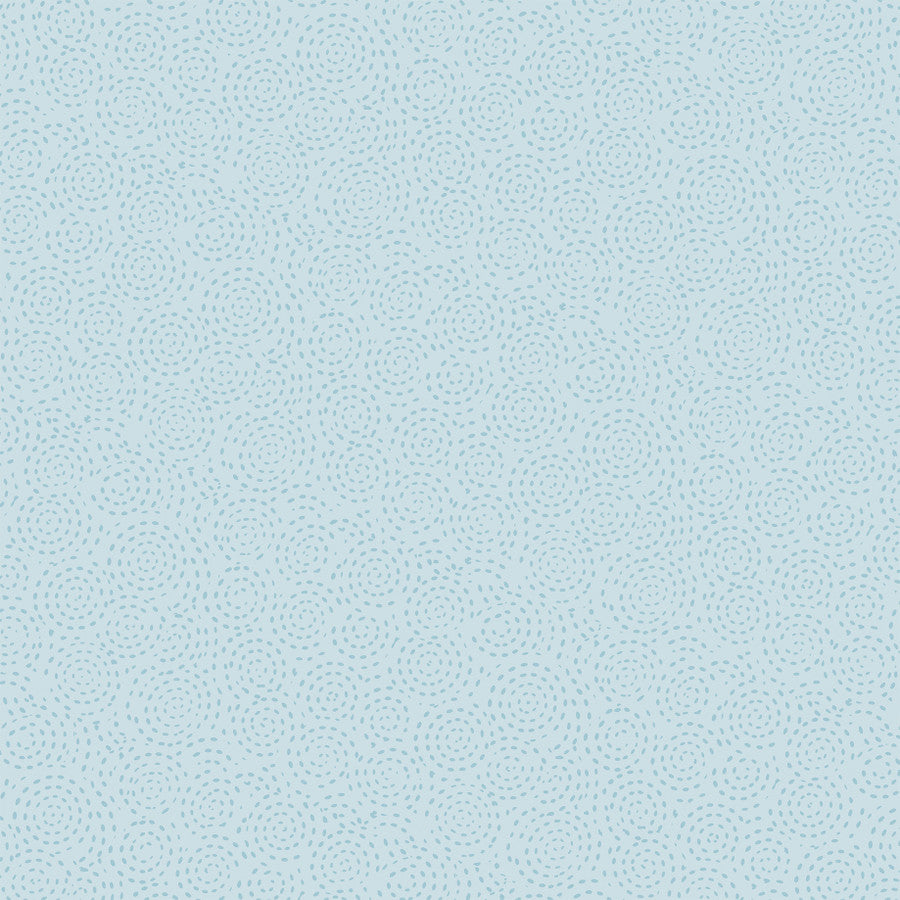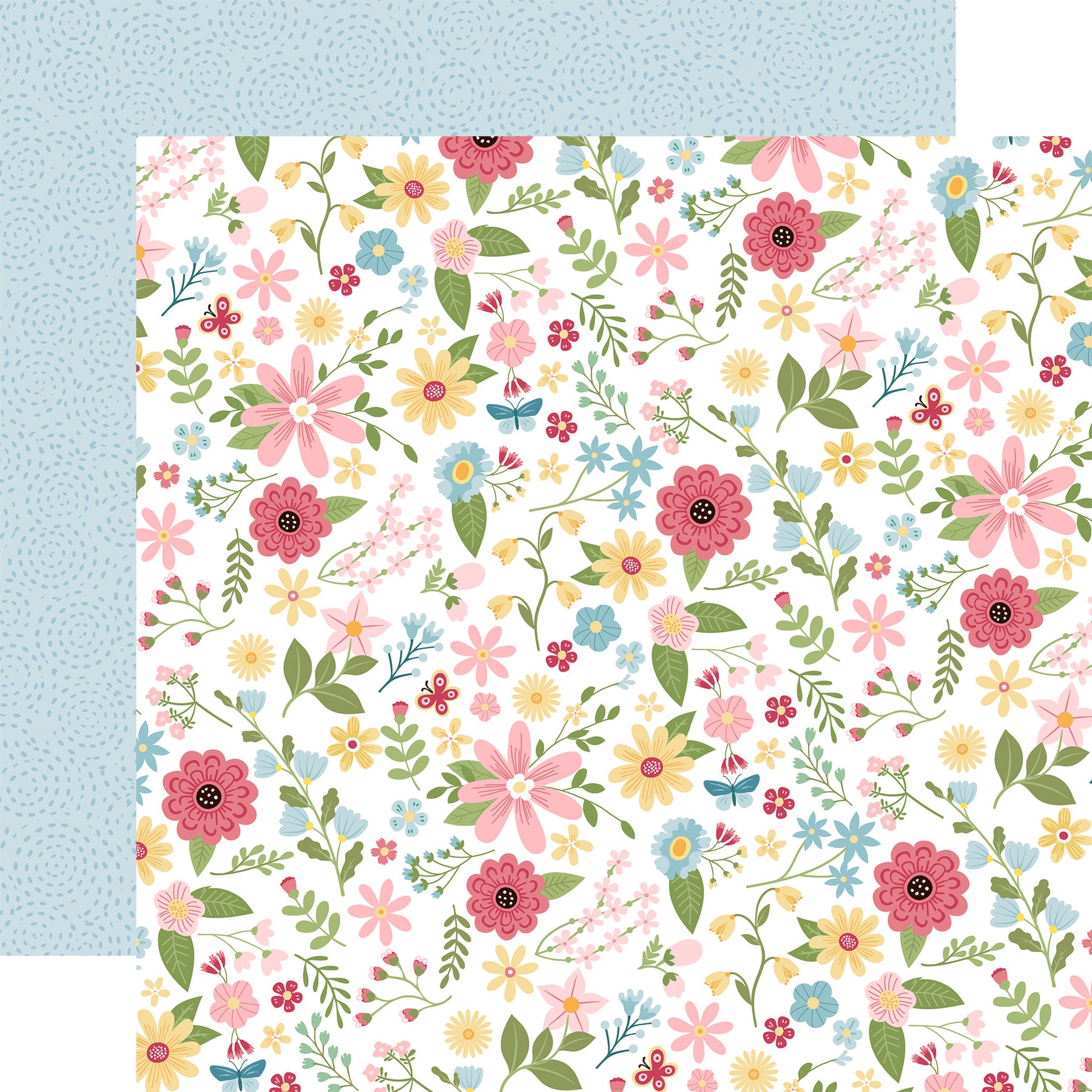 - (Side A - a whimsical, dense floral pattern set against a clean white background. It is composed of a variety of illustrated wildflowers, leaves, and small butterflies rendered in a soft pastel color palette of blush pink, buttery yellow, sky blue, and sage green. Side B - a subtle, repeating pattern of small, dark blue dashed lines arranged in concentric circles and swirling motifs. Set against a soft, pale powder blue background, the hand-drawn quality of the dots creates a gentle, textured effect reminiscent of ripples in water)*