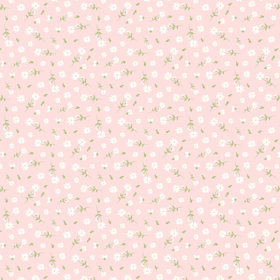- (Side A - a cheerful, spring-themed collection of nine journaling cards or scrapbooking panels featuring a pastel color palette of pink, mint green, sky blue, and yellow. The designs are filled with floral motifs, garden imagery, and uplifting sentiments like "Sun Smiles & Fresh Blooms," "You Make My Heart Bloom," and "A Little Sunshine for your day!" Illustrated elements include a pink rain boot used as a vase, a bluebird in a birdhouse, and a floral envelope, all tied together with patterns of polka dots, stripes, and dainty wildflower prints. Side B - a delicate, vintage-inspired floral pattern set against a soft, pastel pink background. The design is composed of tiny, hand-drawn white daisies with pale yellow centers, scattered alongside dainty green leaves and stems)*