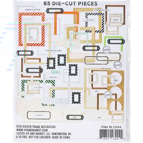 Packaging of Vicki Boutin Frame Necessities die-cut cardstock pieces with 49 and Market branding.