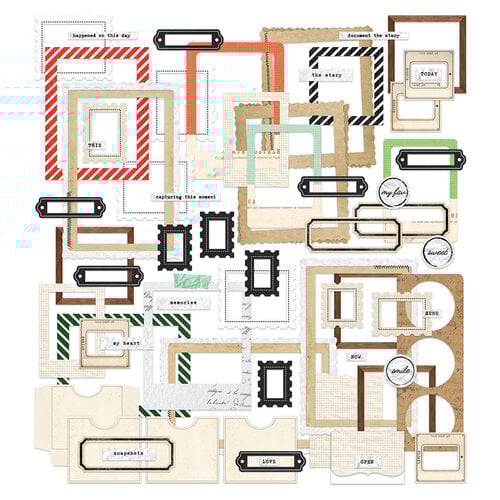 A collection of die-cut paper frames, tags, labels, and small pockets for scrapbooking and memory keeping. The elements are varied in size, shape, and style, including decorative scalloped edges, plain rectangles, and mini pocket folders. The color palette is neutral primarily (cream, tan, brown, black) with accents of red, green, and mint, sometimes featuring simple patterns like stripes. Several elements also include small text or labels such as "TODAY," "memories," "snapshot," "LOVE," and "document the story."