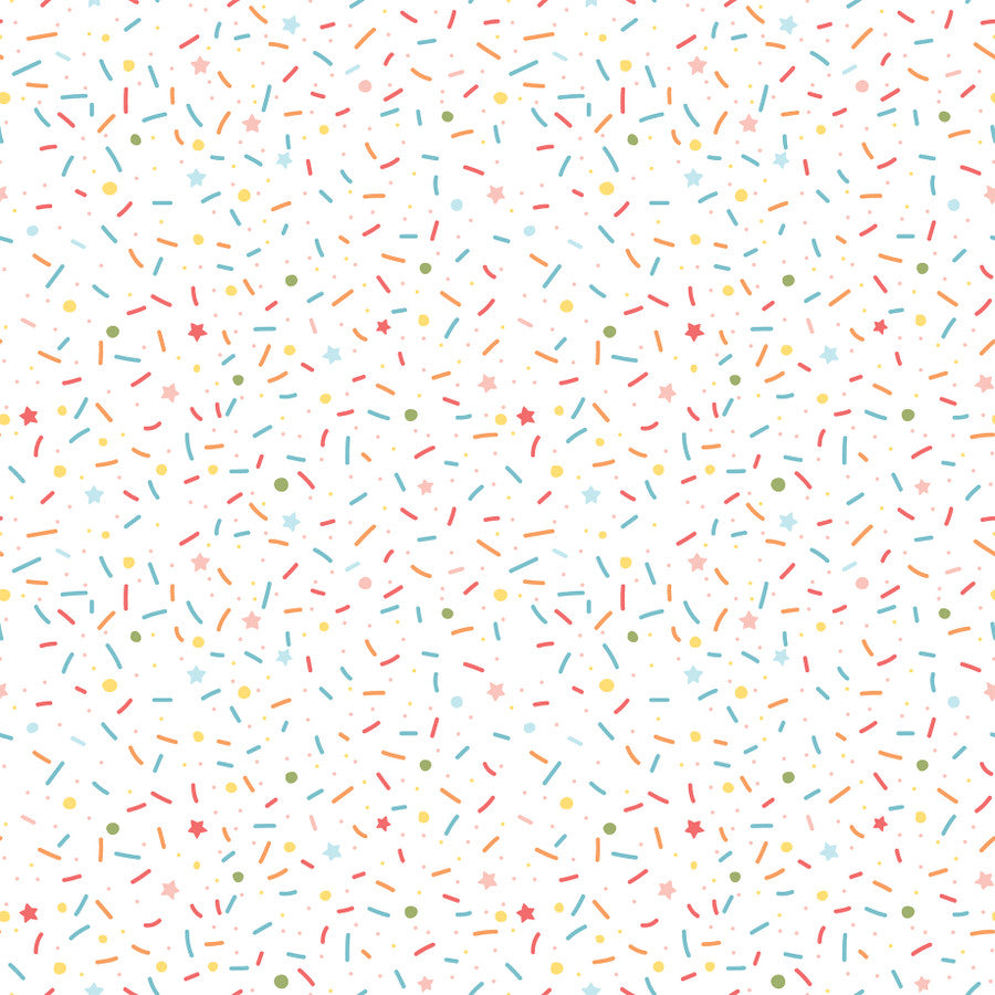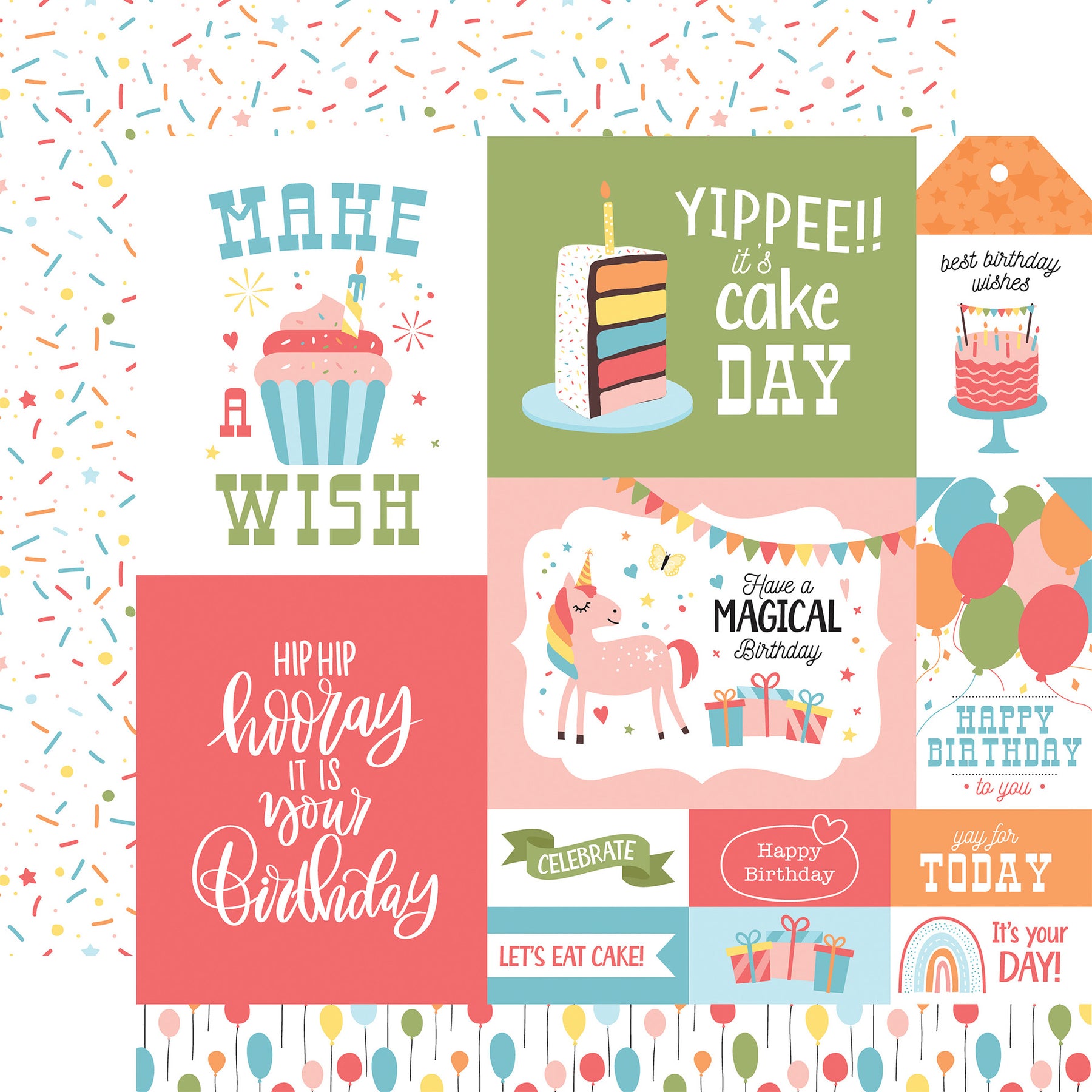 - (Side A - birthday-themed journaling cards and decorative tags, featuring a playful mix of pastel and bold colors. The designs include cheerful illustrations of multi-layered cakes, cupcakes, unicorns, and balloons, paired with celebratory typography like "Hip Hip Hooray," "Make a Wish," and "Yippee!! It's Cake Day." Side B - a repeating pattern of colorful confetti in shades of red, yellow, blue, orange, and pink. The hearts are evenly spaced on a white background)*