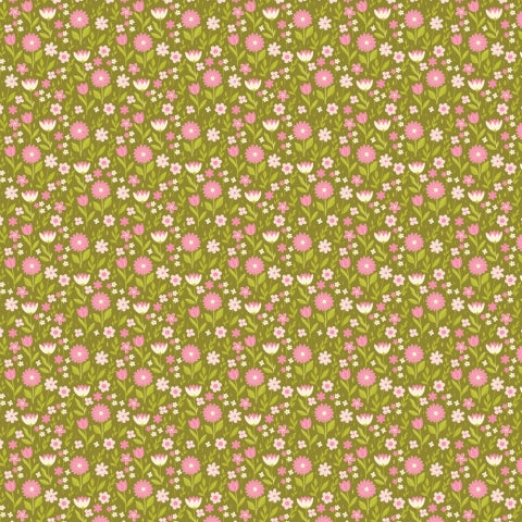 • (Side A -whimsical, spring-themed illustration collage featuring a soft pastel palette of greens, pinks, and yellows. It consists of various decorative squares and rectangles depicting garden and nature motifs, including garden gnomes, birdhouses, snails, frogs, and a greenhouse filled with plants. Interspersed among these illustrations are charming phrases like "Pure Sunshine," "Bloom & Grow," and "Hello Spring," along with icons of tea, rain boots, and blooming flowers. Side B - a dense, seamless floral pattern set against a muted olive-green background. The design consists of a variety of small, stylized flowers in shades of pink, white, and pale yellow, including daisy-like blooms and upright tulips. Scattered green leaves and tiny blossoms fill the spaces between the larger flowers, creating a vibrant and cohesive meadow-inspired aesthetic)*