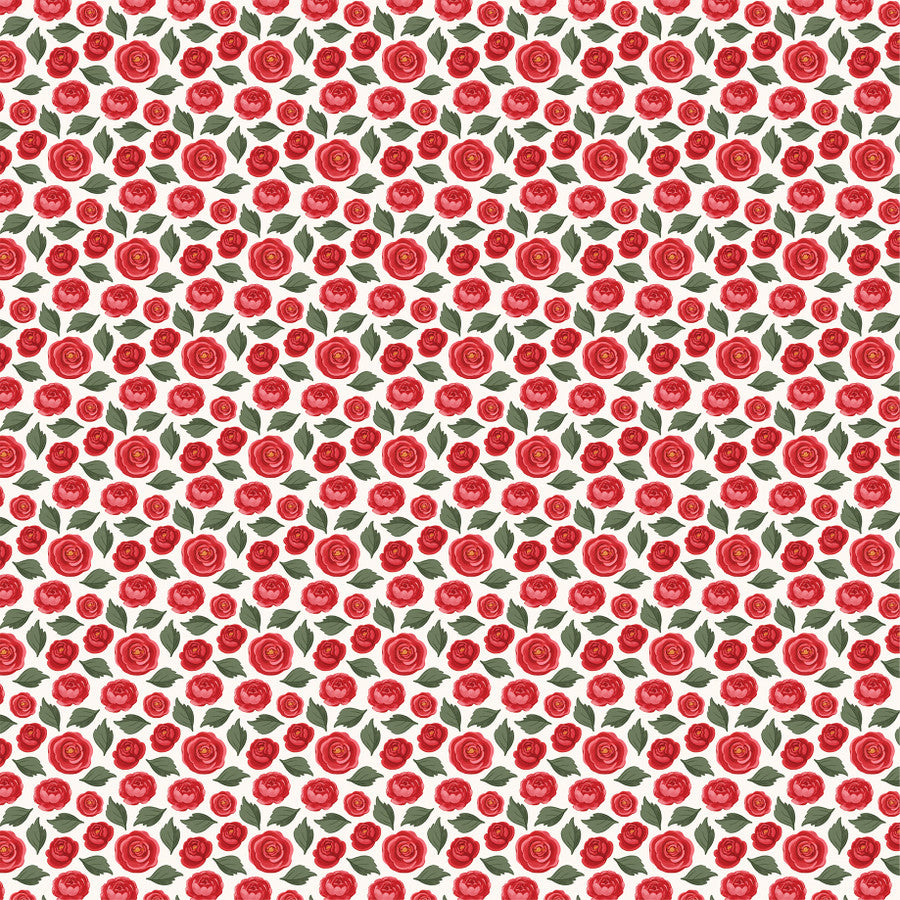 - (Side A - vintage-themed Valentine’s Day journaling cards and decorative elements, featuring a romantic palette of red, pink, cream, and black. The layout includes four large vertical cards, four smaller square/rectangular cards, and a central row of seven postage stamp-style stickers. The illustrations are whimsical and classic, showcasing motifs such as floral arrangements, lovebirds in a gilded cage, a Parisian-style flower shop, perfume bottles, and antique keys. Each card is accented with elegant typography and sentimental phrases like "You make my heart so full" and "Love is in the air." Side B - repeats a floral pattern on a cream-colored background. The design consists of densely packed red roses of varying sizes, interspersed with small green leaves)*