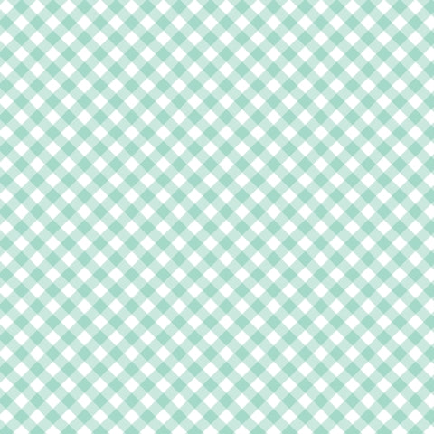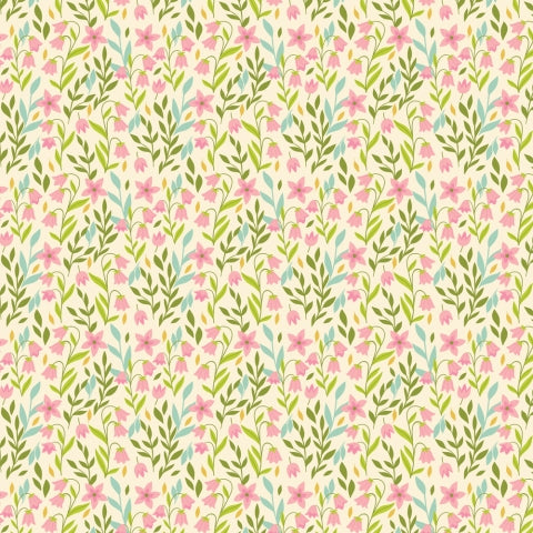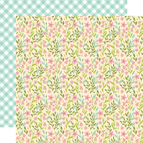 • (Side A - a repeating floral pattern with a whimsical, cottage-core aesthetic. The design consists of delicate pink flowers—some open with five petals and others shaped like hanging bells—interspersed among a variety of green, sage, and light teal leaves. Set against a soft cream-colored background, Side B - diagonal gingham check pattern in teal and white)*