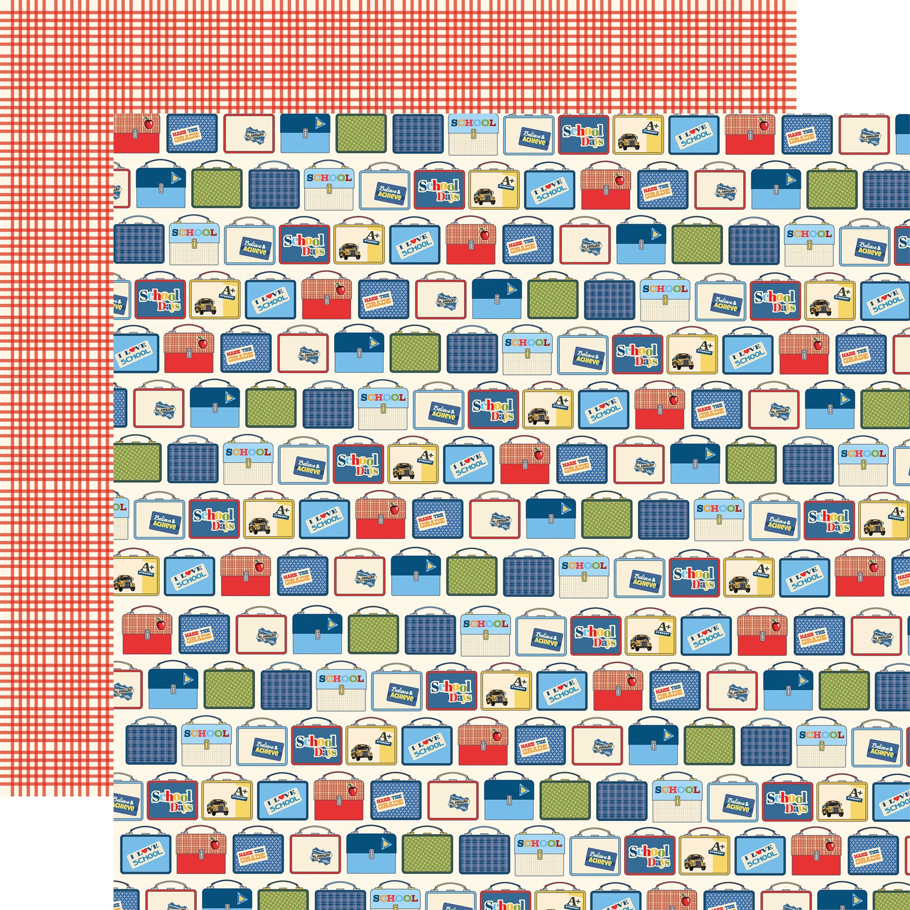 - Side A - like pattern of vintage-style metal lunch boxes set against a cream-colored background. The lunch boxes come in a variety of school-themed designs, including solid colors like blue and green, red-and-white checkers, and several with nostalgic motifs such as yellow school buses, "School Days" lettering, and "I Love School" stickers. Side B - red and white grid pattern. It consists of thin, horizontal and vertical red lines crossing over a cream background)