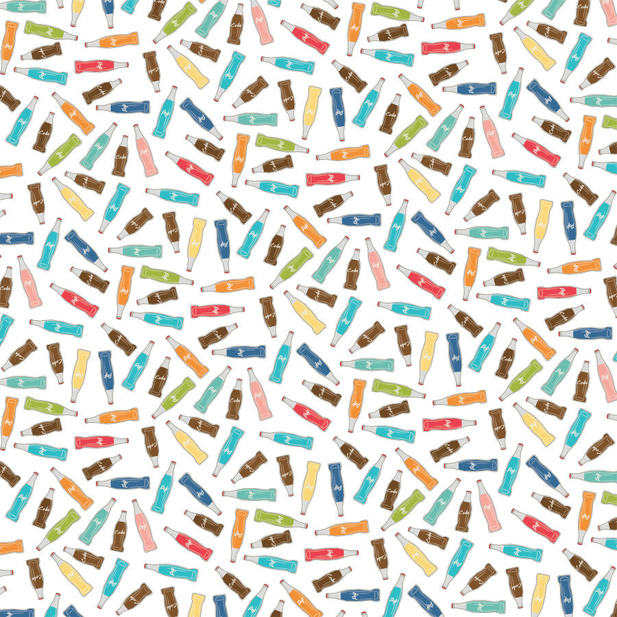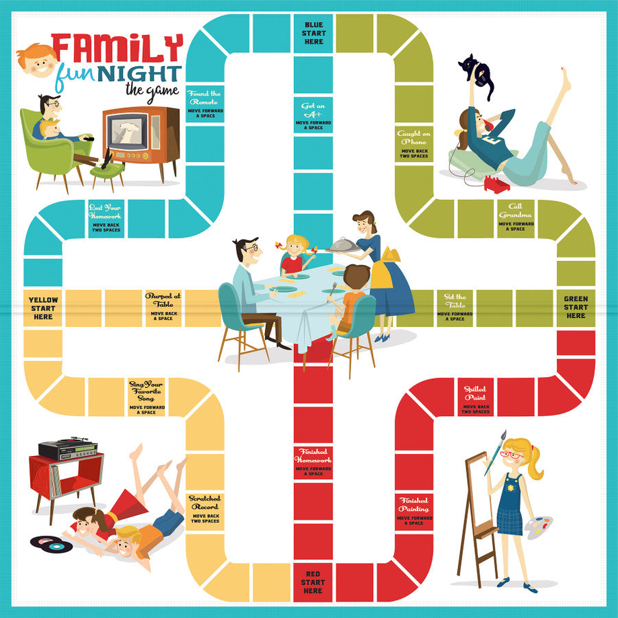 - Side A - a whimsical, repeating pattern of various soda and pop bottles scattered across a clean white background. The bottles are illustrated in a simple, hand-drawn style with thin outlines and are tilted at various angles to create a sense of movement. The color palette is vibrant yet soft, including shades of teal, orange, lime green, brown (cola), pink, and navy blue. Some bottles are labeled with "Pop" or "Cola," contributing to a nostalgic, retro aesthetic. Side B - retro-styled board game titled "Family Fun Night the Game." The game board is organized into a large cross shape, with four distinct colored paths—blue, green, red, and yellow—each beginning at a designated "Start Here" space on the outer edges and leading toward a central illustration of a family eating dinner. Each path is populated with themed squares that provide instructions, such as "Got an A+" (move forward) or "Spilled Paint" (move back). The corners of the board are decorated with charming mid-century modern illustrations of family activities, including watching TV, talking on a rotary phone, listening to records, and painting)