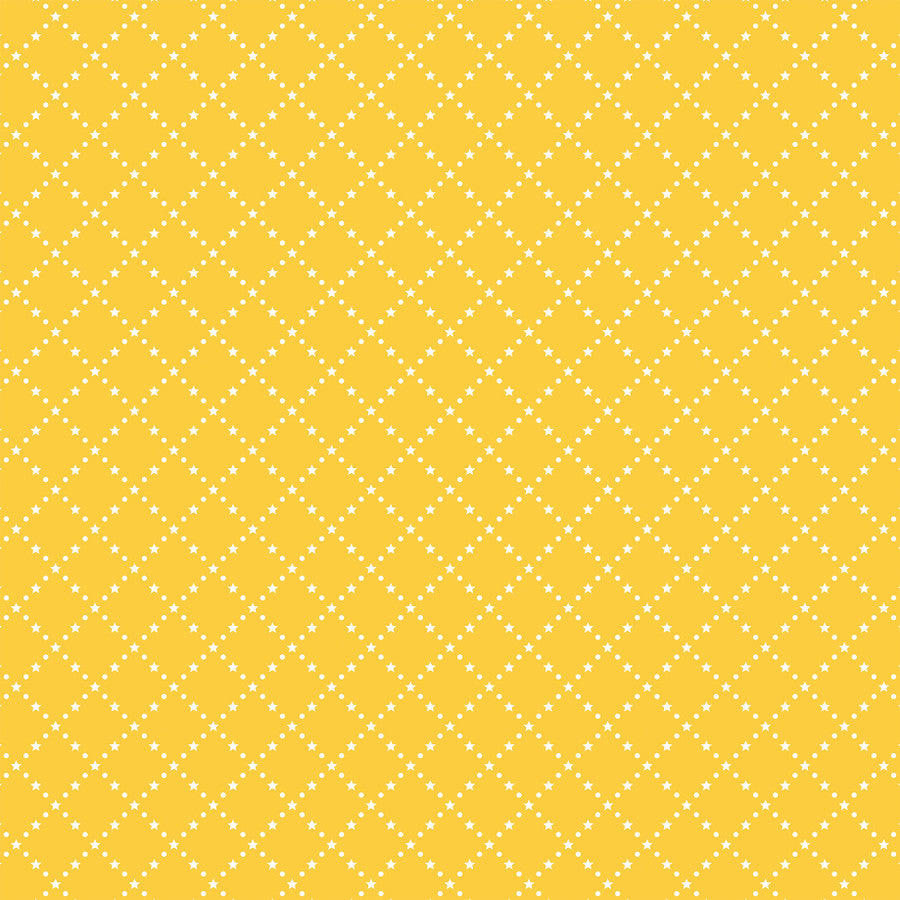 - (Side A - a bright, summery repeating pattern set against a clean white background. The design centers on lemonade stands with multi-colored striped awnings (pink, teal, red, and navy), accompanied by a variety of fruit and garden motifs. Interspersed throughout are yellow pineapples, baskets of lemons, glasses of lemonade, strawberries, cherries, and vibrant floral clusters in red and blue. Small details like colorful pinwheels and little blue birds add a whimsical, playful feel to the overall aesthetic; Side B - vibrant yellow background with a delicate, white geometric pattern. The design consists of a diagonal grid (trellis) formed by small white dots, with miniature white five-pointed stars positioned at each intersection)*